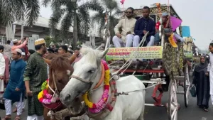 আনন্দ মিছিলের অগ্রভাগে দুই সারিতে ছিল আটটি সুসজ্জিত ঘোড়া। আরও ছিল ১৫টি ঘোড়ার গাড়ি,আর ছিল মোগল ও সুলতানি আমলের ইতিহাস সংবলিত ১০টি পাপেট শো।