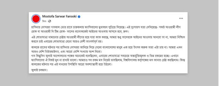পোস্টের শেষে মোস্তফা সরয়ার ফারুকী লিখেছেন, ‘জুলাই চলমান।’