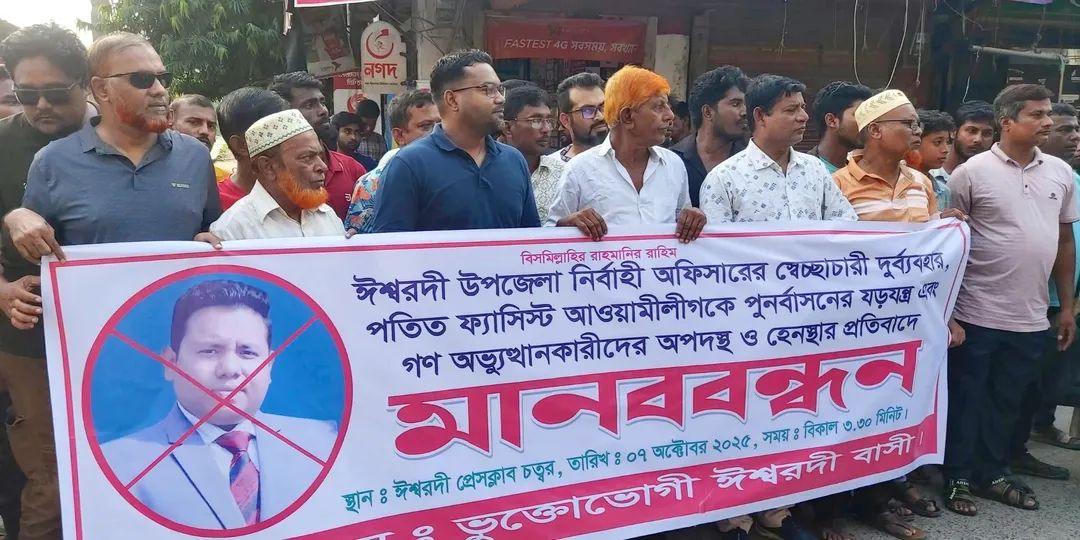 পাবনার ঈশ্বরদীতে নবাগত উপজেলা নির্বাহী কর্মকর্তা মোঃ মনিরুজ্জামানের বিরুদ্ধে আওয়ামিলীগকে পূনর্বাসনের চেষ্টার অভিযোগ এনে ভুক্তভোগী ঈশ্বরদীবাসীর ব্যানারে সড়কে নেমে মানববন্ধন