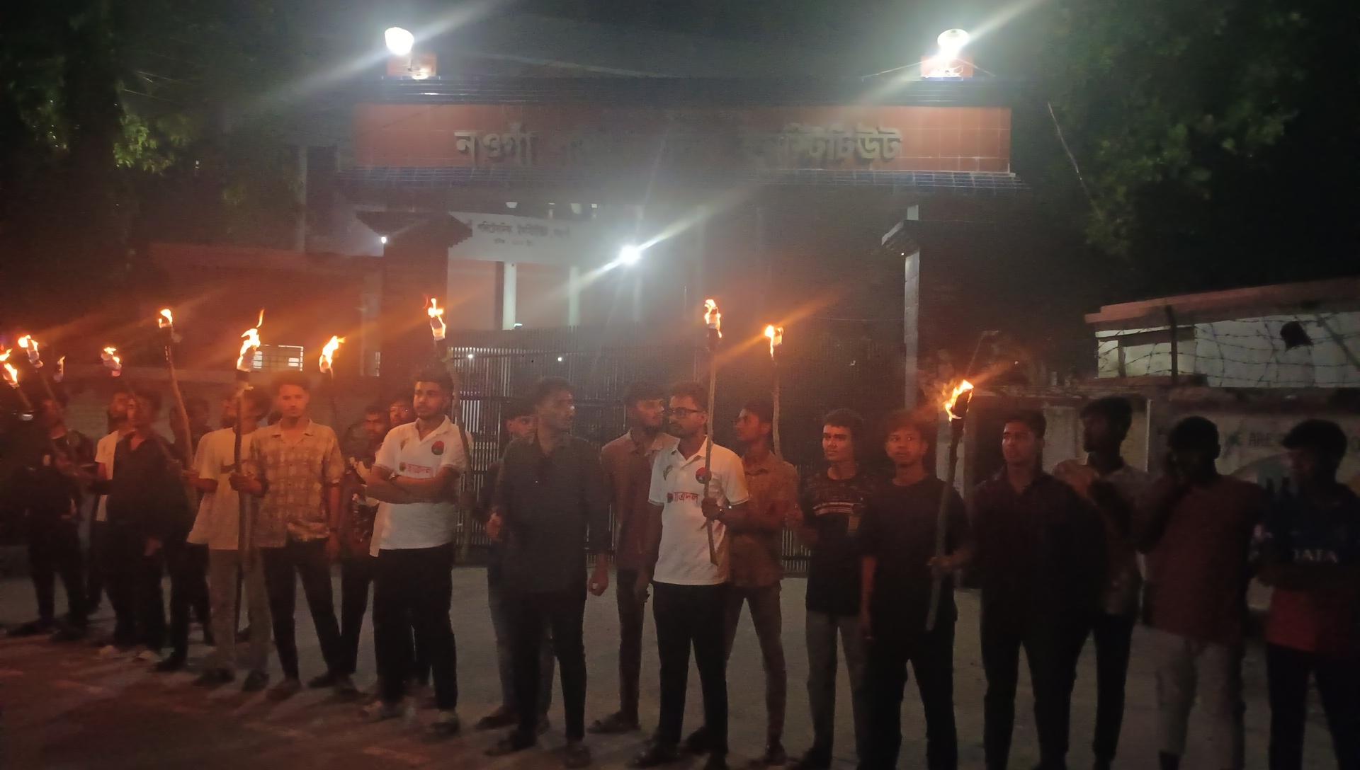 ঢাকায় ব্যবসায়ী সোহাগ হত্যার প্রতিবাদে নওগাঁ পলিটেকনিক ইনস্টিটিউট ছাত্রদলের উদ্যোগে মশাল মিছিল ও প্রতিবাদ সভা অনুষ্ঠিত হয়েছে। শনিবার রাত সাড়ে