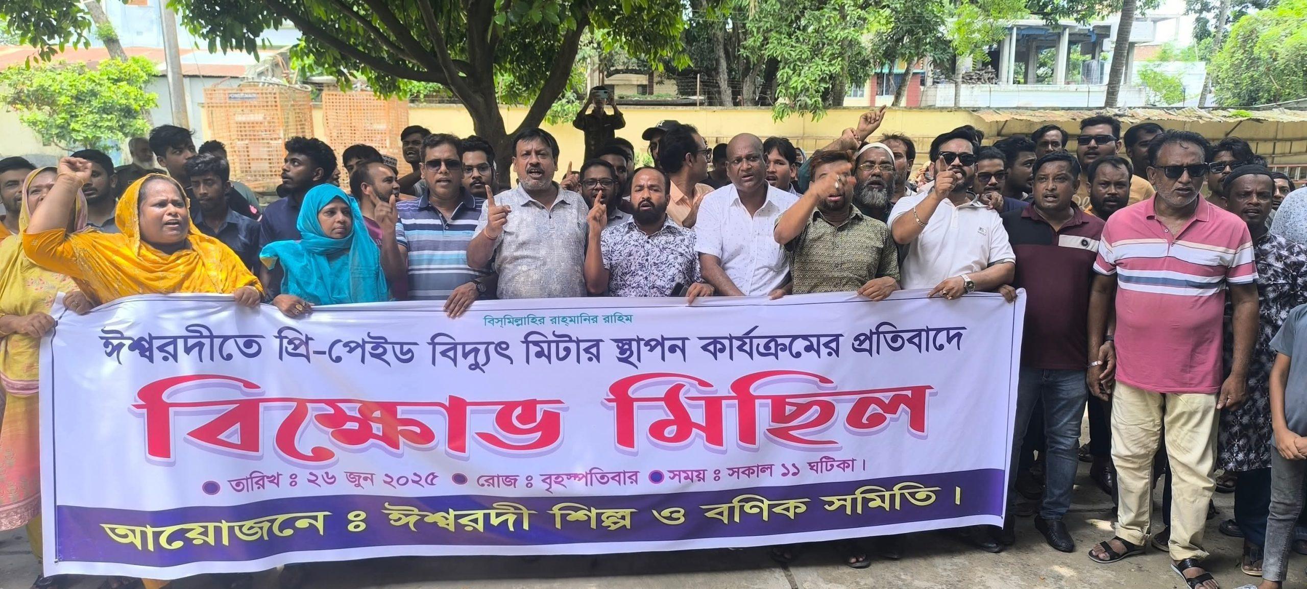 পাবনার ঈশ্বরদীতে বৈদ্যুতিক প্রি-প্রেইড মিটার স্থাপন কার্যক্রম বন্ধের দাবিতে ঈশ্বরদী শিল্প ও বণিক সমিতি আয়োজিত বাজারের সকল ব্যবসায়ীদের নিয়ে বিক্ষোভ
