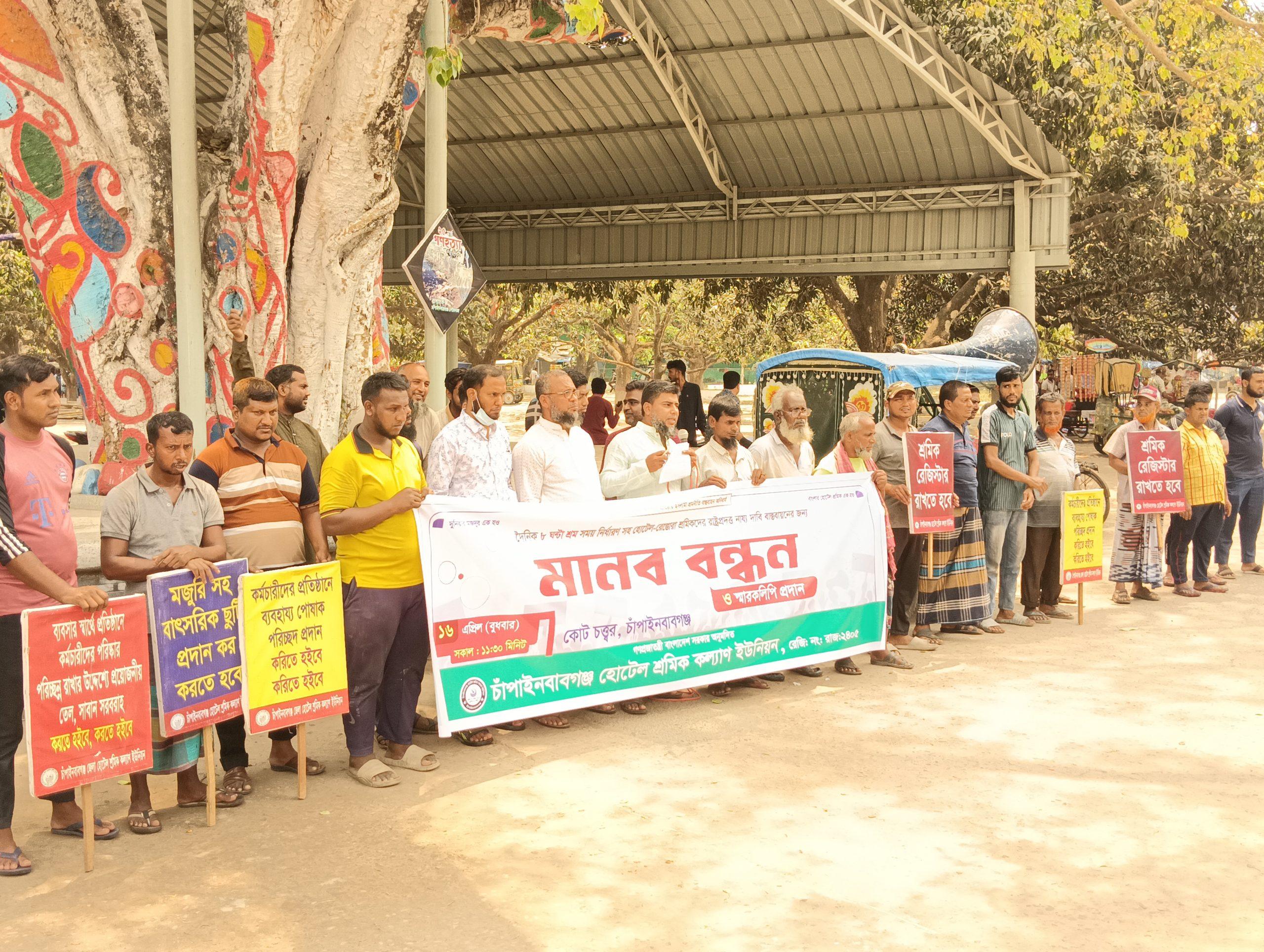দৈনিক ৮ ঘন্টা শ্রম সময় নির্ধারণসহ হোটেল রেস্তরাঁ শ্রমিকদের রাষ্ট্র প্রদত্ত ন্যায্য দাবি বাস্তবায়নের জন্য চাঁপাইনবাবগঞ্জে মানববন্ধন অনুষ্ঠিত হয়েছে। বুধবার