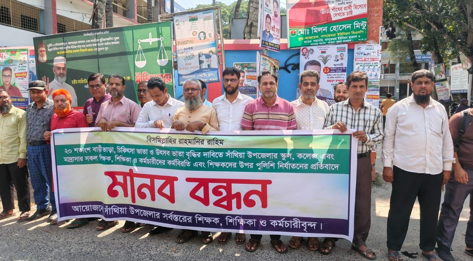 শিক্ষকদের দাবীর সাথে সংহতি এবং শিক্ষকদের ওপর পুলিশি নির্যাতনের প্রতিবাদে সাঁথিয়ায় মানব বন্ধন