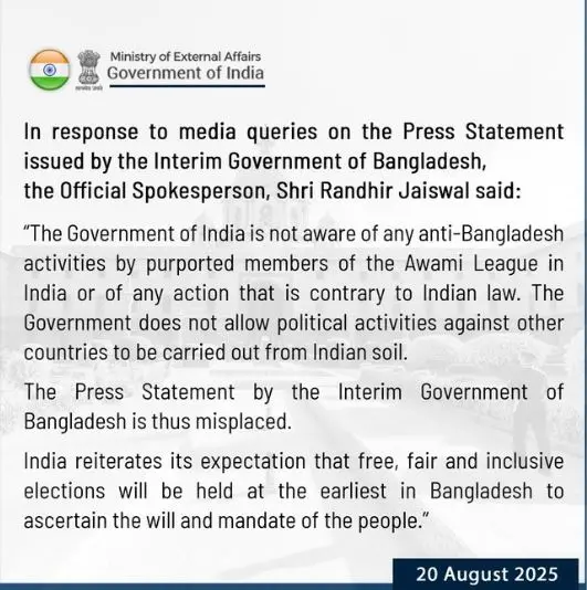 ভারতে আওয়ামী লীগের রাজনৈতিক অফিস বন্ধ করার আহ্বান জানিয়ে ভারত সরকারের উদ্দেশে বাংলাদেশ যে বিবৃতি দিয়েছে তার প্রতিক্রিয়া জানিয়েছে ভারত