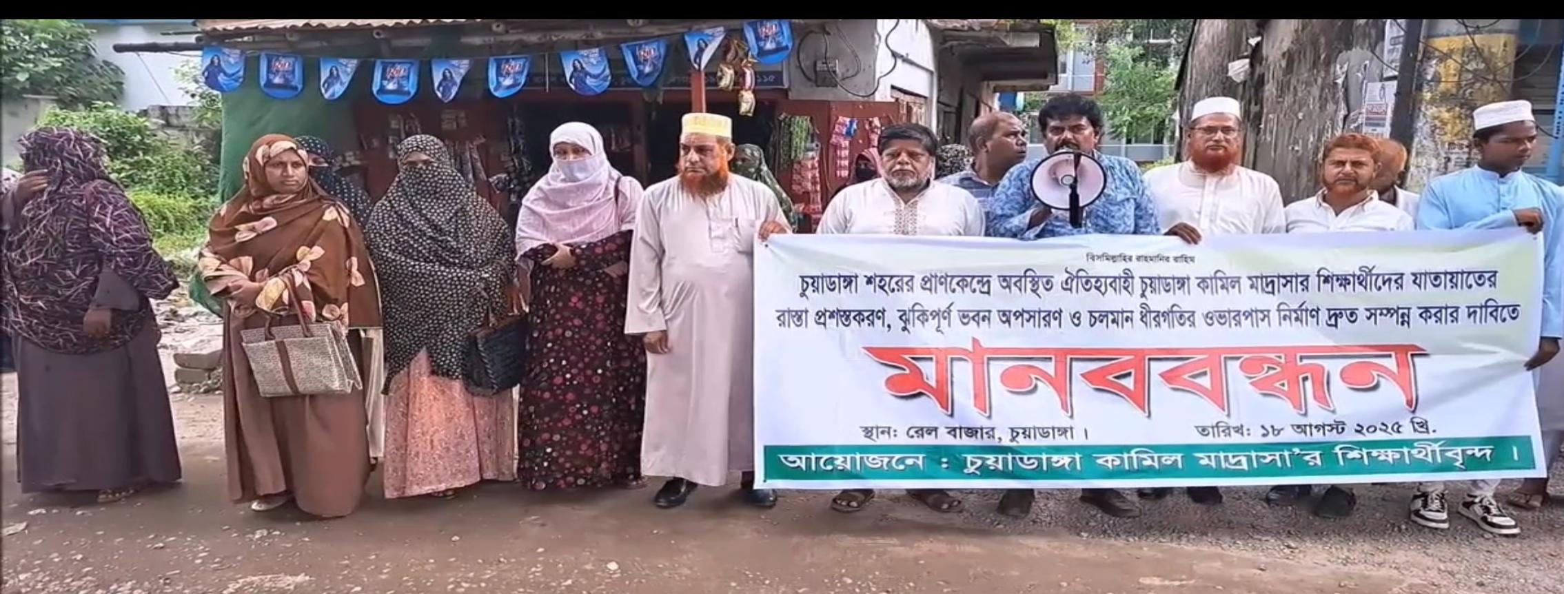 চুয়াডাঙ্গায় রেলগেটের ওভারপাস দ্রুত নির্মাণ , রাস্তা প্রশস্তকরণ ও ঝূকিপূর্ণ ভবন অপসারণের দাবিতে মানববন্ধন কর্মসূচি পালন করেছে স্থানীয় জনসাধরণ ও