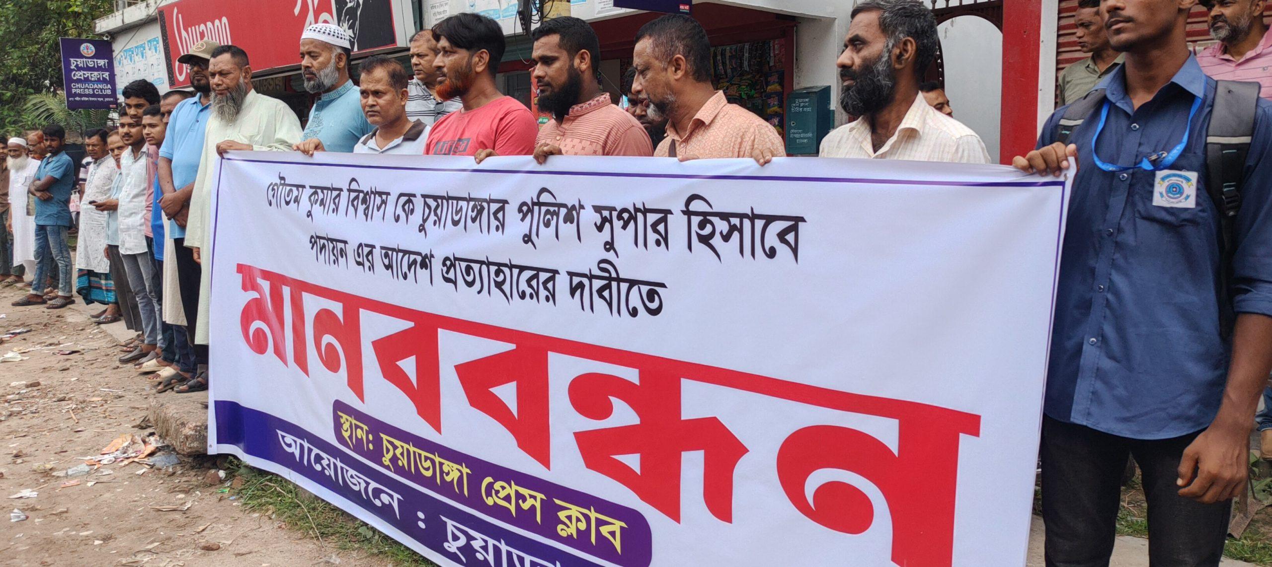 চুয়াডাঙ্গায় পুলিশ সুপার হিসেবে গৌতম কুমার বিশ্বাসকে পদায়নের আদেশ প্রত্যাহারের দাবিতে মানববন্ধন