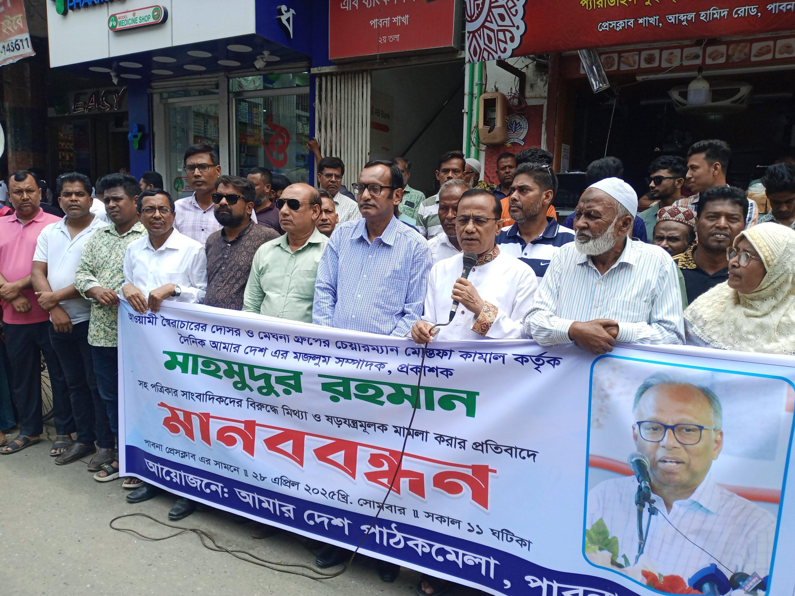 পাবনায় আমার দেশ পত্রিকার সম্পাদকের বিরুদ্ধে মিথ্যা মামলা প্রত্যাহারে দাবিতে মানববন্ধন