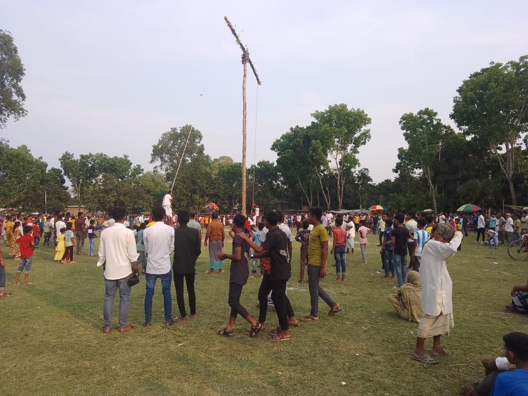 নিজের শরীরে লোহার বড়শি ফুটিয়ে খোলা মাঠে ‘চড়ক’ গাছে ঘুরপাক খেয়ে নেচে গেয়ে তা পালন করা হলো চড়ক’ উৎসব। সোমবার