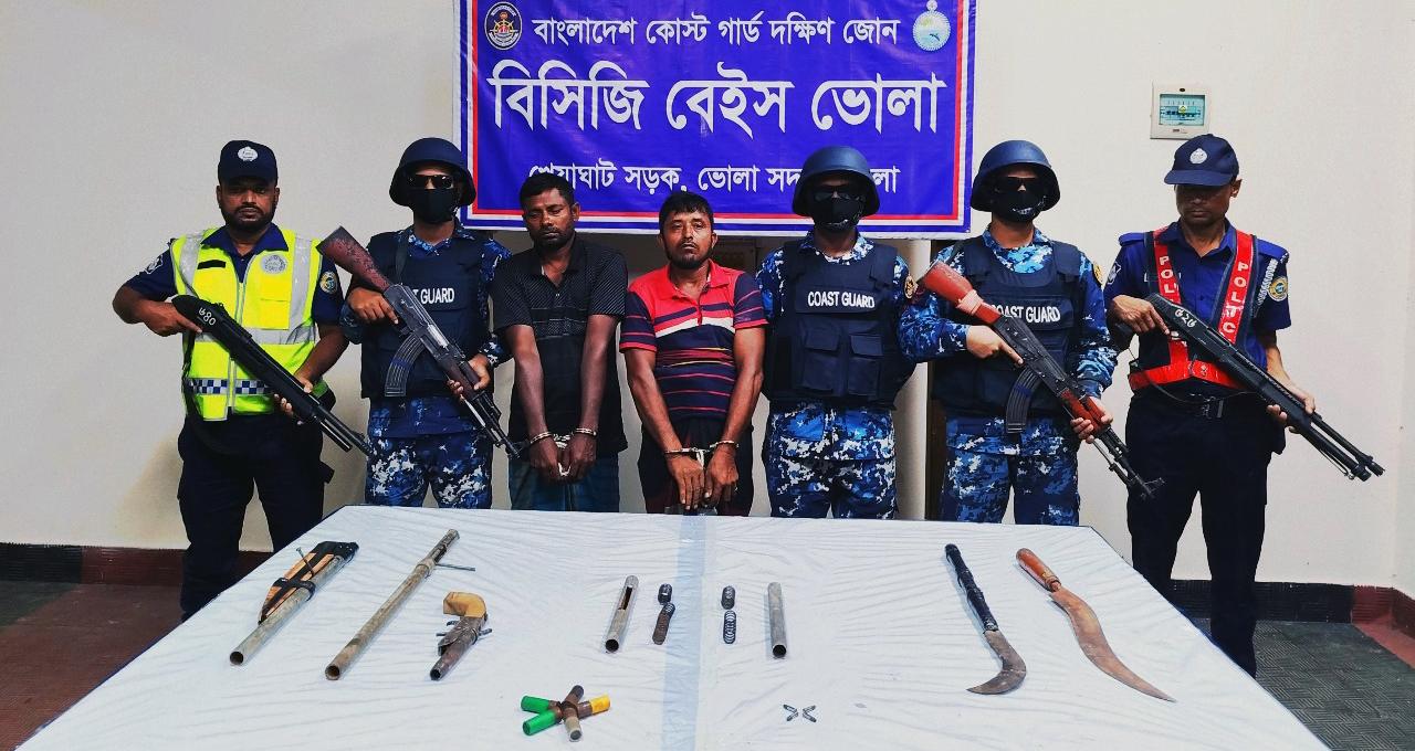 ভোলার দৌলতখানে কোস্টগার্ড ও পুলিশের যৌথ অভিযানে দুর্ধর্ষ ডাকাত সিরাজ বাহিনীর ২ জন সদস্য ৩টি দেশীয় আগ্নেয়াস্ত্র, অস্ত্র তৈরির সরঞ্জাম,