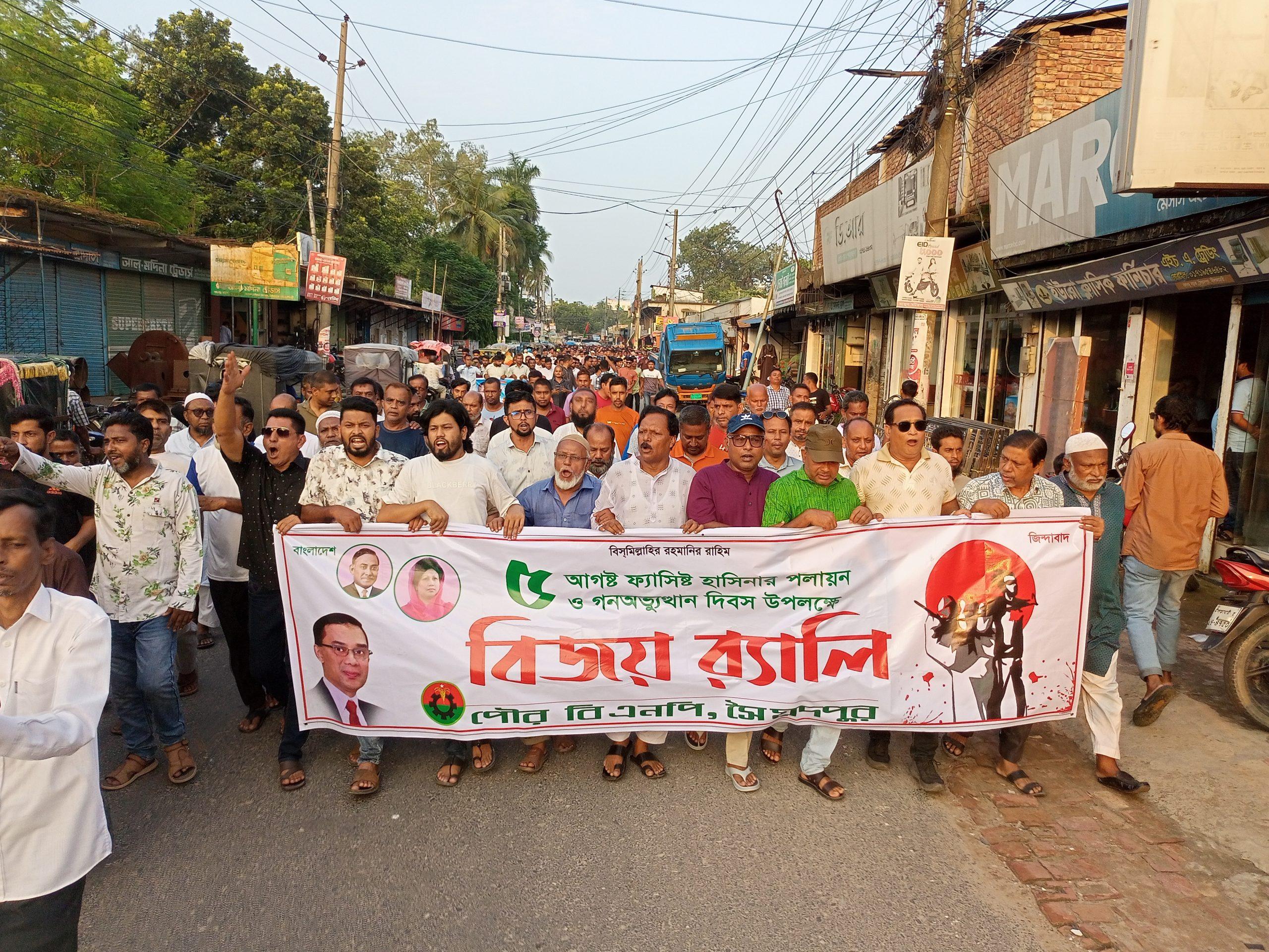 ফ্যাসিষ্ট আওয়ামী লীগ সরকার পতন হওয়ার এক বছর পূর্তি উপলক্ষ্যে আনন্দ মিছিল ও পথসভা করেছে সৈয়দপুর রাজনৈতিক জেলা বিএনপি। ৬