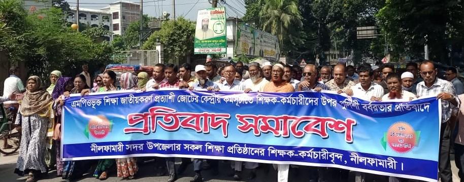 এমপিও ভুক্ত শিক্ষা জাতীয়করণ প্রত্যাশী জোটের কেন্দ্রীয় কর্মসূচিতে শিক্ষক-কর্মচারীদের ওপর পুলিশের বর্বর হামলার প্রতিবাদে নীলফামারীতে প্রতিবাদ সমাবেশ হয়েছে। মঙ্গলবার দুপুরে(১৪অক্টোবর)