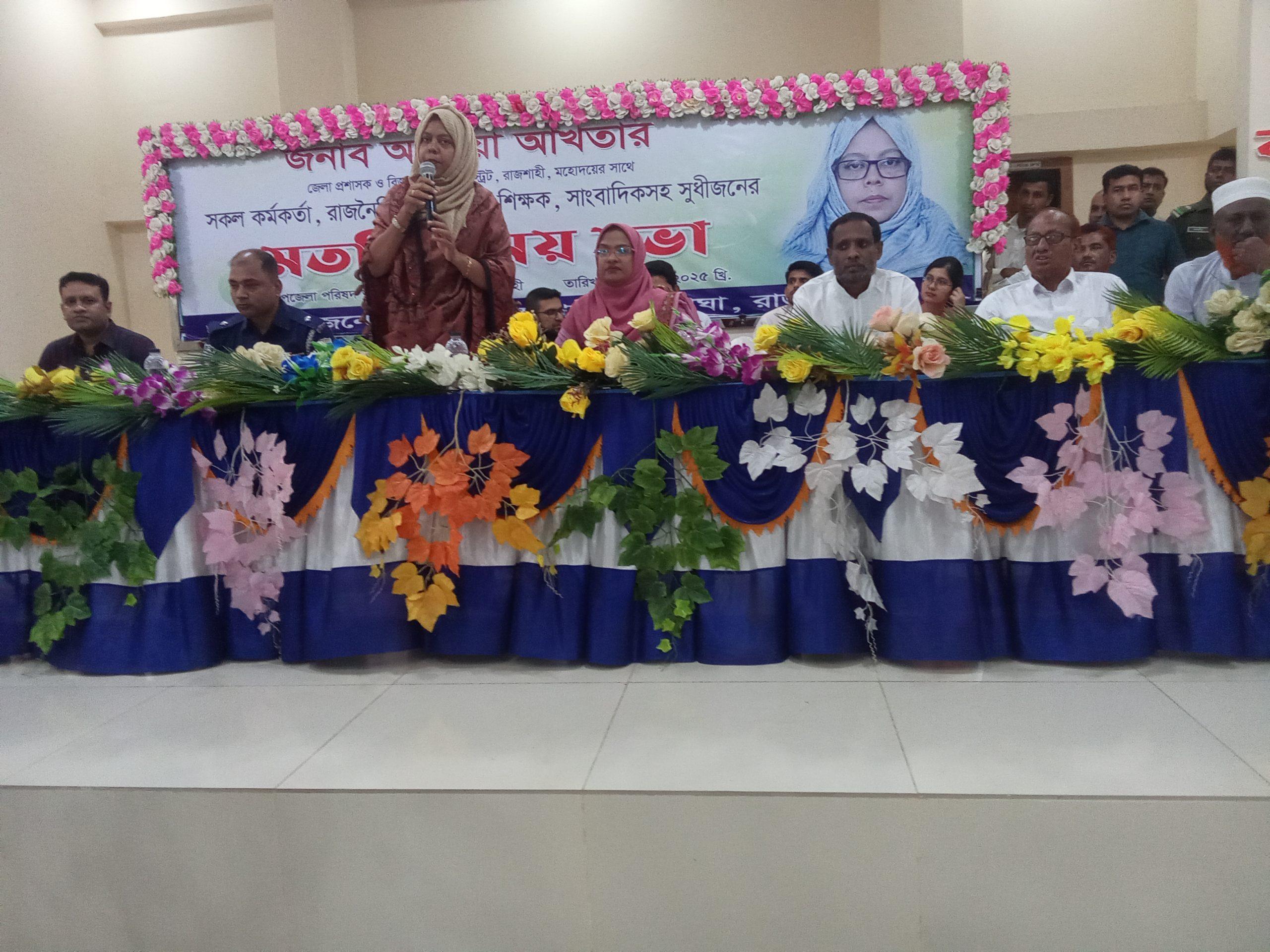 রাজশাহী জেলা প্রশাসক ও বিজ্ঞ জেলা ম্যাজিস্ট্রেট আফিয়া আখতার বলেছেন আমরা রাষ্ট্রের পক্ষ থেকে সেবা দিতে এসেছি। সঠিকভাবে সেবা দিতে