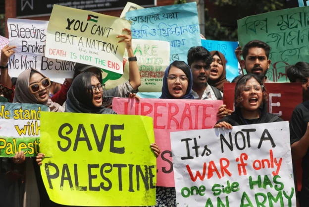 গাজায় হামলার প্রতিবাদে বাংলাদেশের শিক্ষার্থীদের বিক্ষোভ মানববন্ধন