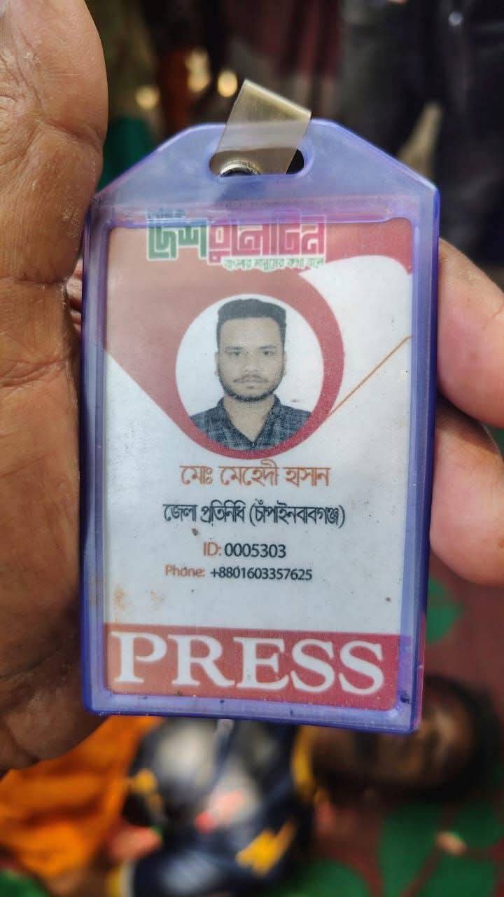 চাঁপাইনবাবগঞ্জে ট্রেনে কাটা পড়ে মেহেদি হাসান নামে স্থানীয় এক সাংবাদিকের মৃত্যু হয়েছে। আজ শনিবার বেলা পৌনে ১২টার সময় সদর উপজেলার