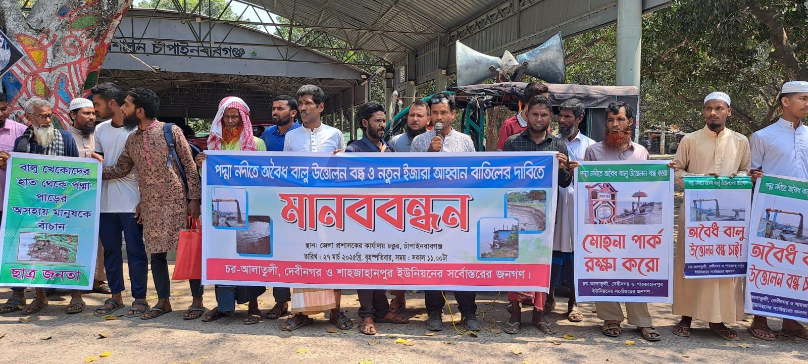 পদ্মায় অবৈধ বালু উত্তোলন বন্ধ ও ইজারা বাতিলের দাবিতে চাঁপাইনবাবগঞ্জে মানববন্ধন